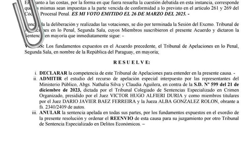 El magistrado preopinante, José Agustín Fernández, argumentó que la sentencia apelada carecía de fundamentos sólidos y no contenía una motivación suficiente que justificara la absolución. En consecuencia, consideró imprescindible reenviar el caso para un nuevo juzgamiento a cargo de un Tribunal de Sentencia especializado en causas económicas.