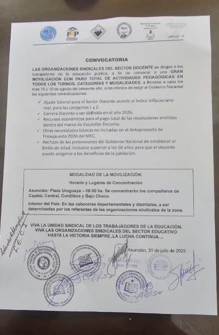 Entre las organizaciones firmantes de la convocatoria se encuentran la UNE, la Organización de Trabajadores de la Educación (OTEP-Auténtica), la Agremiación de Docentes del Paraguay (Adofep), la Asociación Paraguaya de Educadores (APE) y la Federación de Educadores del Paraguay (FEP). En Asunción, la concentración se realizará en la Plaza Uruguaya durante ambas jornadas.