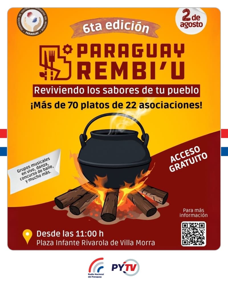 La feria gastronómica “Paraguay Rembi’u” regresa este sábado 2 de agosto a la Plaza Infante Rivarola, en el corazón de Villa Morra, con una propuesta que combina tradición, cultura y sabor. En su sexta edición, el evento reunirá más de 70 platos típicos del interior del país y promete ser un encuentro festivo con entrada libre, música y danzas folclóricas.