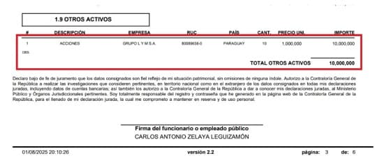 Según declaraciones juradas de intereses, Zelaya fue director del estudio jurídico hasta julio de 2024, mes en que asumió como director de Gabinete de Conaderna. Además, declaró 10 acciones por valor de G. 10 millones en Law & Medicine SA, lo que evidencia una relación patrimonial directa con el bufete.