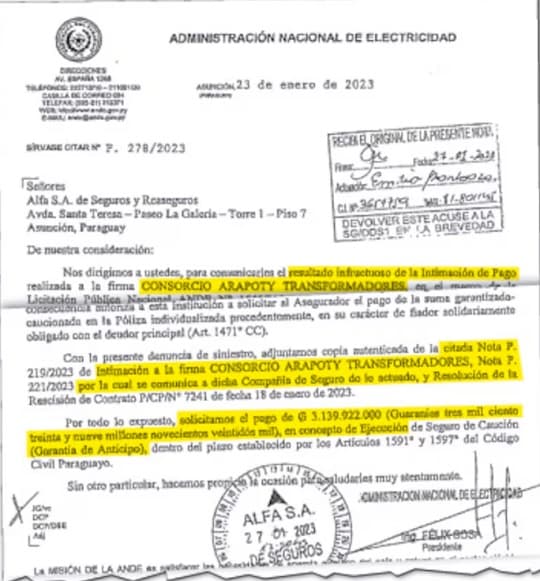 Más de G. 4.852 millones siguen sin ser reembolsados a la Administración Nacional de Electricidad (ANDE) por parte del Consorcio Arapoty y la aseguradora ueno Seguros. La deuda corresponde al anticipo y a la garantía de cumplimiento de un contrato millonario incumplido para la provisión de transformadores.