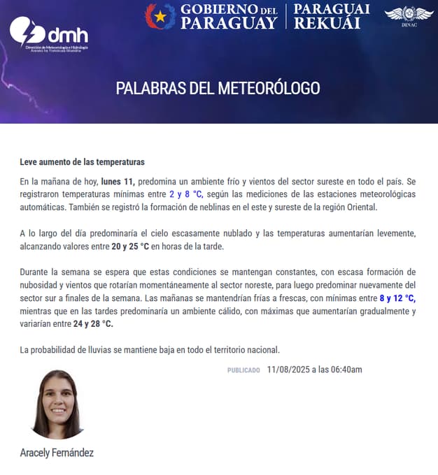 La jornada de este lunes 11 de agosto amaneció con un ambiente frío y vientos del sureste, según datos de la Dirección de Meteorología. Las temperaturas mínimas, registradas por estaciones automáticas, oscilaron entre 2 °C y 8 °C, con presencia de neblinas en sectores del este y sureste de la región Oriental.