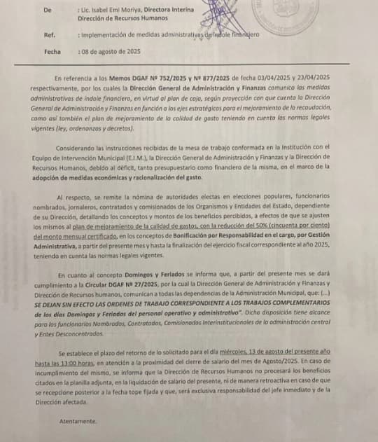 La movilización se originó tras la difusión de un memorando fechado el 8 de agosto de 2025, firmado por la directora interina de Recursos Humanos, Isabel Emi Moriya, que establecía una reducción del 50% en las bonificaciones por responsabilidad de cargo y gestión administrativa desde este mes y hasta fin de año. También suspendía las órdenes de trabajo para domingos y feriados del personal operativo y administrativo.