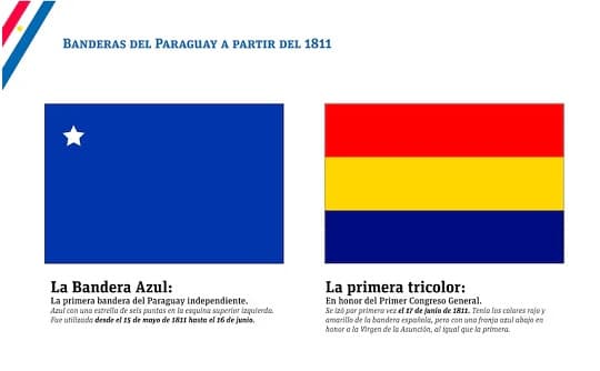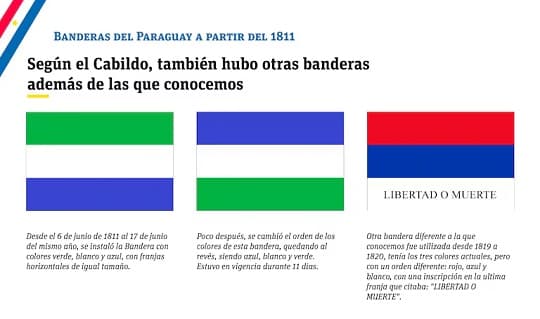 Antes de llegar a este formato, Paraguay utilizó otros diseños menos conocidos. Según El Cabildo, en junio de 1811 hubo versiones con franjas verde, blanca y azul; y otra con el orden invertido (azul, blanco y verde), ambas vigentes por pocos días. Entre 1819 y 1820, existió también una bandera tricolor en rojo, azul y blanco, con la inscripción “Libertad o Muerte” en la franja inferior.
