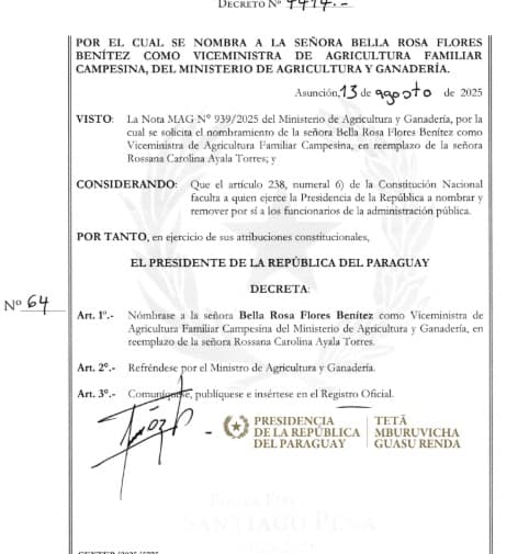 La designación de Bella Rosa Flores Benítez como viceministra de Agricultura Familiar Campesina, dependiente del Ministerio de Agricultura y Ganadería (MAG), generó cuestionamientos, ya que la funcionaria enfrenta un proceso judicial por presunta estafa y otros delitos. La decisión fue tomada por el presidente Santiago Peña en reemplazo de la ingeniera Rossana Ayala, quien pasará a cumplir otras funciones.