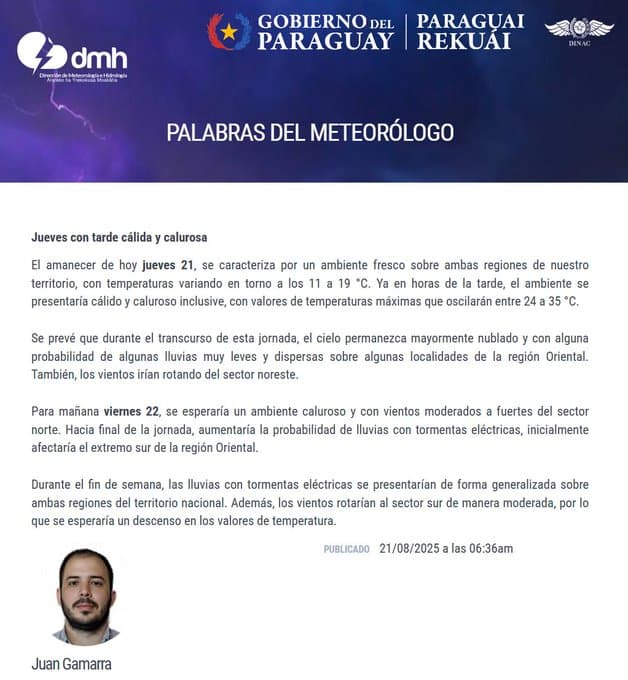Para el viernes, el pronóstico indica que las temperaturas continuarán elevadas, con máximas de entre 23°C y 36°C en la región Oriental, mientras que en el Chaco los registros podrían trepar hasta los 39°C, confirmando así la persistencia del calor.