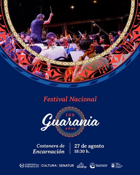El Festival Nacional de la Guarania se realizará el 27 de agosto en la costanera de Encarnación para conmemorar el centenario de este género musical paraguayo. El evento cuenta con acceso libre y gratuito a partir de las 18:30 horas, organizado por el Gobierno nacional a través de la Secretaría Nacional de Cultura con apoyo de la Secretaría Nacional de Turismo.