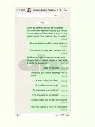 En la comunicación, Rodríguez expresa su decepción hacia el interventor: “Mira que yo te respetaba bastante!! Pero jamás imaginé que te ibas a comportar así! Vos sabes que yo no soy delincuente! Y me quisiste hacer quedar”, según la transcripción literal de los mensajes difundidos.