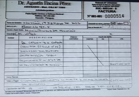 La factura, fechada el 17 de mayo de 2023, corresponde a servicios vinculados a un caso de lesión de crédito. Esta operación se ubica entre las más onerosas registradas en los últimos años por la administración municipal, según el propio informe remitido al Congreso Nacional.