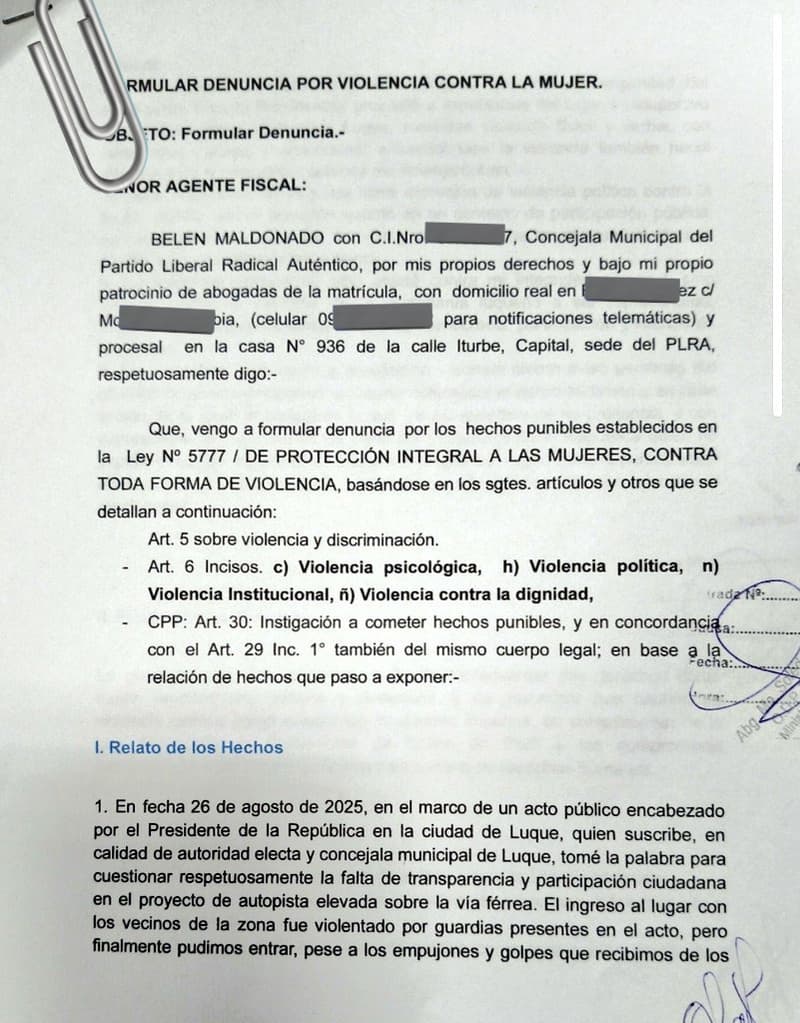 La concejal de Luque, Belén Maldonado (PLRA), presentó una denuncia penal contra el presidente de la República, Santiago Peña, tras el incidente registrado durante un acto oficial en la Cooperativa Luque. La edil sostiene que fue víctima de agresión por parte del personal de seguridad presidencial y acusa al mandatario de haber permitido y fomentado un acto de violencia política en su contra.