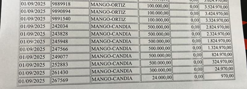 Los registros señalan que se efectuaron transacciones por G. 3.624.000 hacia dos cuentas de billeteras Mango: G. 3.324.000 a nombre de Lilian Eugenia Candia Aranda y G. 300.000 a la de Cyntia Mabel Ortiz Arevalos. Además, los responsables extendieron de manera irregular el límite de su tarjeta de crédito de G. 10 millones a G. 22 millones.