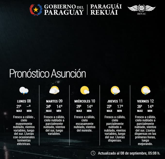 El informe también resalta un progresivo aumento de las temperaturas. En Asunción y Ciudad del Este se prevén máximas de 21 grados, en Encarnación llegarían a 19 y en la región del Chaco podrían alcanzar hasta 35 grados.