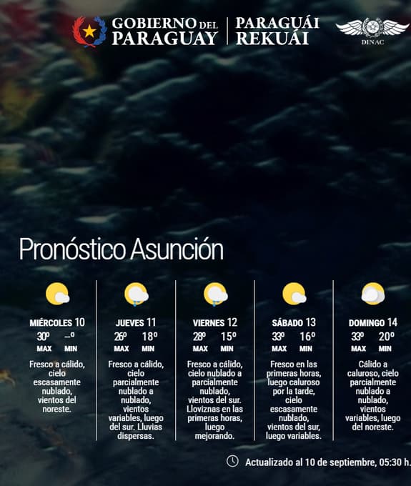 Hacia el transcurso de la jornada, un marcado aumento de la temperatura será observado, alcanzando niveles que variarán entre 25 y 34 °C en el este del país. En el Chaco, las máximas se elevarían aún más, con registros de entre 35 y 36 °C.