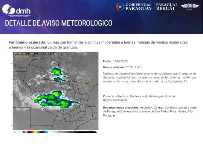 Un aviso meteorológico fue emitido en la mañana, alertando sobre lluvias con tormentas eléctricas de intensidad moderada a fuerte. La posibilidad de ráfagas de viento y la eventual caída de granizos fue mencionada en el informe, lo que genera preocupación en sectores productivos y urbanos.