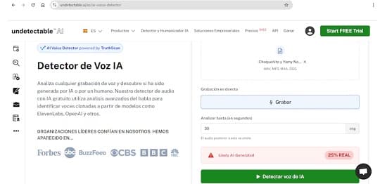 Otra herramienta utilizada fue Undetectable.ai, que evaluó dos de los audios más extensos y arrojó como resultado “99 % humano”. No obstante, en el caso del tercer audio —donde se menciona una supuesta repartija de 8 millones de dólares vinculados a una donación de Taiwán—, el sistema reportó solo “25 % real”, lo que implica una alta probabilidad de manipulación o generación artificial.