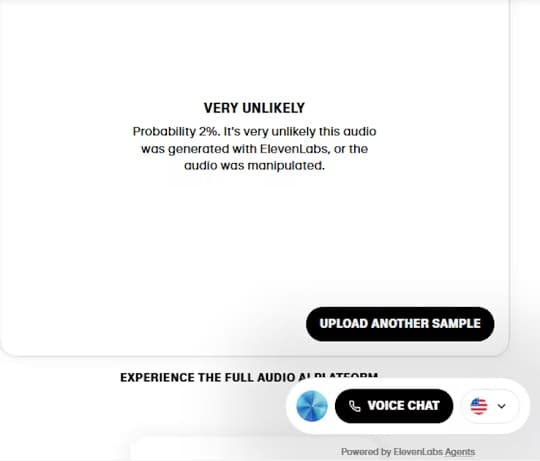 Entre los primeros resultados se destaca el análisis realizado con la herramienta de clasificación de Eleven Labs. Según ABC Digital, los tres audios filtrados fueron cargados en esta plataforma y en todos los casos la probabilidad de haber sido generados con IA fue “muy improbable”, con apenas un 2 %. Este dato sugiere que las voces tendrían un origen humano.