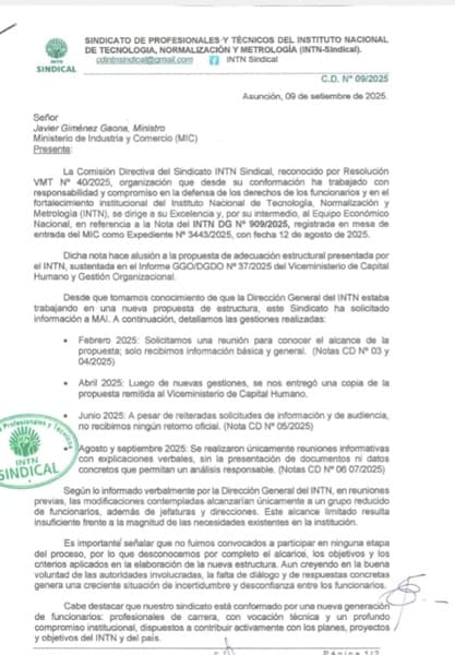 El sindicato del INTN denuncia opacidad en la reestructuración liderada por Lira Giménez y exige aclaraciones al ministro Javier Giménez.