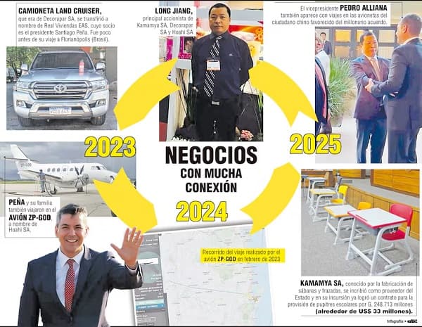 La camioneta Toyota Land Cruiser utilizada por Santiago Peña y su familia para vacacionar en Brasil tras ganar las elecciones internas coloradas pertenecía originalmente a una empresa cuyo dueño posteriormente se convirtió en proveedor de pupitres chinos. El vehículo de la firma del ciudadano chino Long Jiang fue transferido a Real Viviendas EAS de Peña poco antes del viaje, mientras Jiang apareció como vendedor de muebles escolares después de la asunción presidencial.