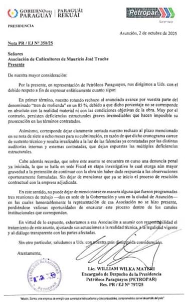 La respuesta oficial fue comunicada a la Asociación de Cañicultores de Troche, que insistía en que la obra se encontraba con un 85% de avance y podía completarse en siete meses. Sin embargo, Petropar afirmó que las auditorías internas y externas no avalan esa versión y detectaron múltiples fallas en la ejecución.