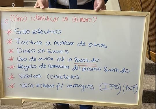 “Trajimos una clase práctica para identificar a un coimero”, ironizó la diputada Ortega, señalando que algunos colegas “parecen necesitar un recordatorio”. En la pizarra figuraban frases como “se maneja solo en efectivo”, “usa facturas a nombre de otros” y “tiene amigos fiscales”, alusiones directas a denuncias públicas sobre el manejo de dinero en la residencia presidencial y las operaciones con proveedores del Estado.