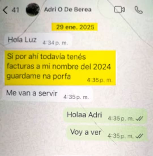 Nuevas revelaciones apuntan a Adriana Ocampos de Berea, hermana de la primera dama Leticia Ocampos, quien habría estado al tanto de que se emitían facturas a su nombre y al de su esposo, César Berea, por compras realizadas en Mburuvicha Róga. La información se desprende de conversaciones entre Ocampos de Berea y la exfuncionaria del Gabinete Civil, Luz Candado.