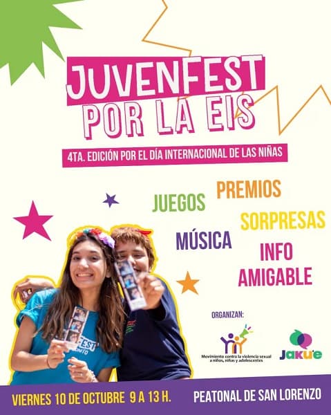 El Movimiento contra la Violencia Sexual hacia Niñas, Niños y Adolescentes, junto con otras organizaciones sociales, realiza este viernes 10 de octubre el Juvenfest, una jornada en reclamo de la implementación de una Educación Integral de la Sexualidad (EIS) en el sistema educativo nacional. El encuentro se desarrollará en la Peatonal de San Lorenzo, de 9:00 a 13:00.
