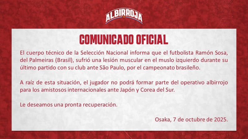 “El cuerpo técnico de la Selección Nacional informa que el futbolista Ramón Sosa, del Palmeiras (Brasil), sufrió una lesión muscular en el muslo izquierdo durante su último partido ante el São Paulo”, informó la Selección Paraguaya a través de un comunicado oficial.