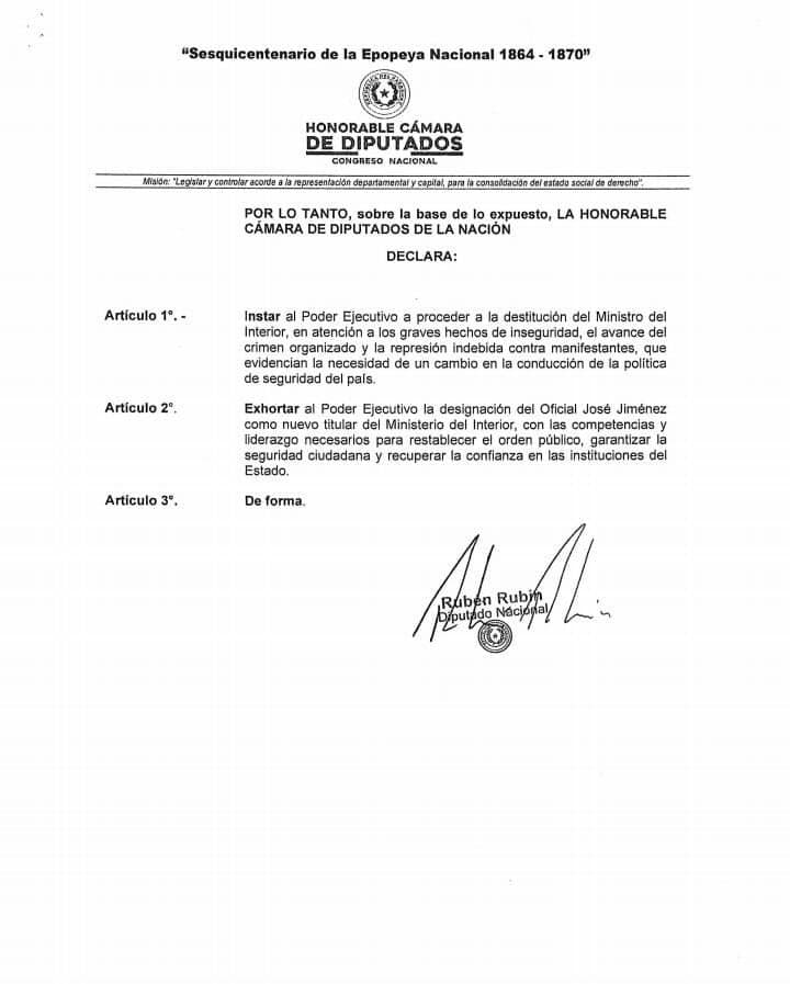 El parlamentario instó al Ejecutivo a tomar medidas urgentes. “Insto al Poder Ejecutivo a proceder a la destitución del ministro del Interior, en atención a los graves hechos de inseguridad”, se lee en el documento. A la vez, exhortó a la designación del oficial José Jiménez “por su patriotismo, honestidad y liderazgo”.