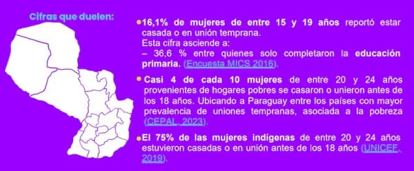 A nivel regional, la Comisión Económica para América Latina y el Caribe (CEPAL) posiciona a Paraguay entre los países con mayor prevalencia de uniones tempranas. Los factores que impulsan este fenómeno incluyen la pobreza extrema, la presión social, los embarazos adolescentes y la falta de acceso a educación sexual integral.