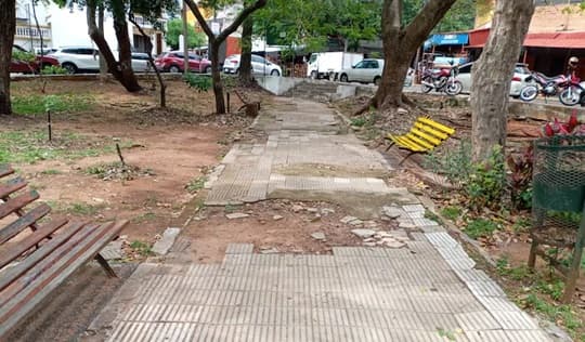 En el barrio Silvio Pettirossi, la plaza Julio César Franco evidencia un deterioro total. Los camineros, veredas y escaleras están destruidos, mientras la falta de vegetación y limpieza refuerza el abandono. La inseguridad y la ausencia de iluminación convierten al sitio en un espacio intransitable para los vecinos.