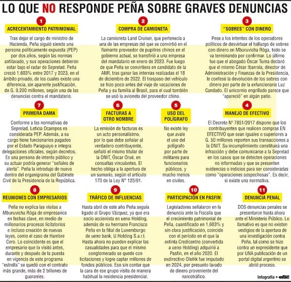 Uno de los ejes de las denuncias es el crecimiento patrimonial del mandatario. Entre 2017 y 2023, su patrimonio neto habría aumentado un 1.603 %, generando una diferencia no explicada de G. 9.200 millones, pese a haber sido considerado persona expuesta políticamente (PEP) durante dos años tras dejar el Ministerio de Hacienda. Tampoco ha brindado explicaciones sobre una camioneta de lujo vinculada a un proveedor de pupitres importados de China, transferida a una empresa de su propiedad en enero de 2023.