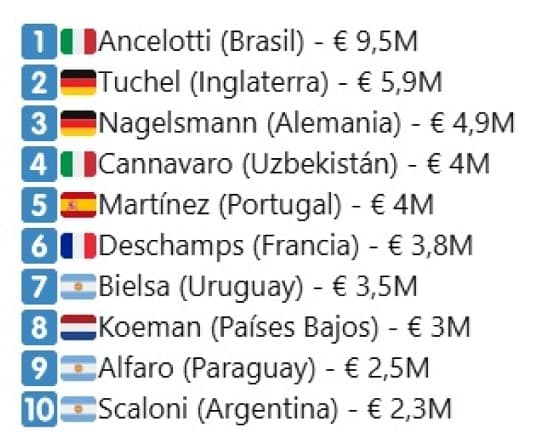La lista está encabezada por el italiano Carlo Ancelotti, actual seleccionador de Brasil, quien percibe 9,5 millones de euros por año (G. 79.000 millones), consolidándose como el técnico mejor pagado del planeta. Le sigue Thomas Tuchel, al mando de Inglaterra, con 5,9 millones de euros anuales (G. 49.000 millones).