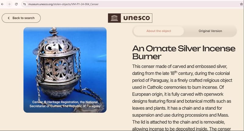 La UNESCO presentó el primer Museo Virtual de Bienes Culturales Robados, una plataforma global que busca crear conciencia sobre el tráfico ilícito de bienes culturales. Paraguay se sumó a esta iniciativa con la incorporación de dos piezas emblemáticas: un incensario del Museo Casa de la Independencia y una lámpara colgante del Panteón Nacional de los Héroes.