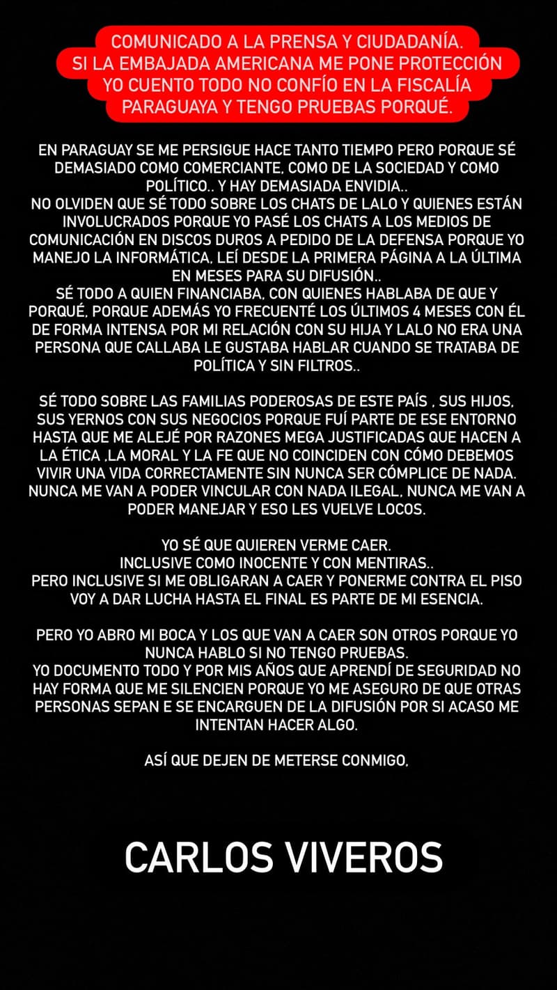 El empresario y político Carlos Viveros, exyerno del fallecido diputado cartista Eulalio “Lalo” Gomes, aseguró tener en su poder información que podría involucrar a figuras “relacionadas con la estructura política y judicial” que habría operado junto al parlamentario. La declaración fue publicada este miércoles en su cuenta de Instagram, donde pidió protección internacional antes de divulgar los datos.