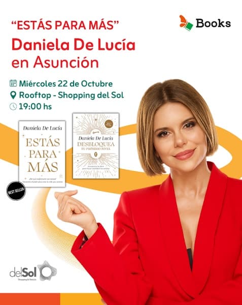 De la mano de Books, Daniela De Lucía, coach internacional, autora best seller y conductora de televisión argentina, visitará Paraguay por primera vez para presentar sus libros Estás para más y Desbloquea tu próximo nivel. La coach desafiará al público paraguayo a crear la vida que se merecen. El evento, que será una charla exclusiva de la autora, tendrá lugar el miércoles 22 de octubre a las 19:00 en el Rooftop del Shopping del Sol con entrada libre y gratuita para todo público.