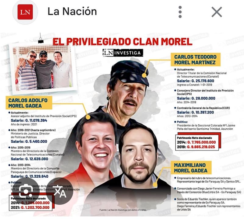Carlos Morel, líder del denominado “Clan Morel” y actual presidente de la Seccional Colorada N.º 1, ha ocupado cargos en la Conatel y el IPS, construyendo redes políticas que, según informes periodísticos, le otorgaron influencia sobre licitaciones estatales.
