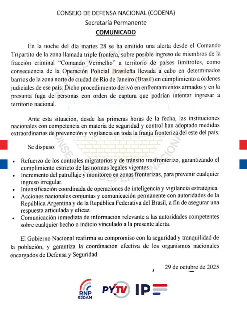 El Consejo de Defensa Nacional (Codena) anunció el refuerzo de los controles migratorios y de tránsito en los pasos fronterizos con Brasil. Esta decisión responde a una alerta emitida desde el Comando Tripartito sobre el posible ingreso al territorio nacional de miembros de la fracción criminal Comando Vermelho. La situación se generó tras un reciente y masivo operativo policial en Río de Janeiro.