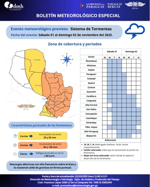 La mayor actividad se concentrará en la Región Oriental. Allí, las lluvias podrían ser más prolongadas y con chaparrones que se repiten. En Ñeembucú, parte de Misiones y el Chaco, el escenario también será inestable, aunque con variaciones según avance el sistema.