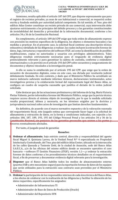 La Fiscalía allanó las oficinas del Banco Atlas en el Atlas Center, barrio Villa Morra de Asunción, dentro de la causa por presunto plagio del core bancario de la firma ITTI. El procedimiento fue dirigido por el fiscal Miguel Quintana, de Propiedad Intelectual, con autorización del juez de Delitos Económicos Rodrigo Estigarribia. La medida se encuadra como otro capítulo penal contra la entidad del Grupo Zuccolillo.