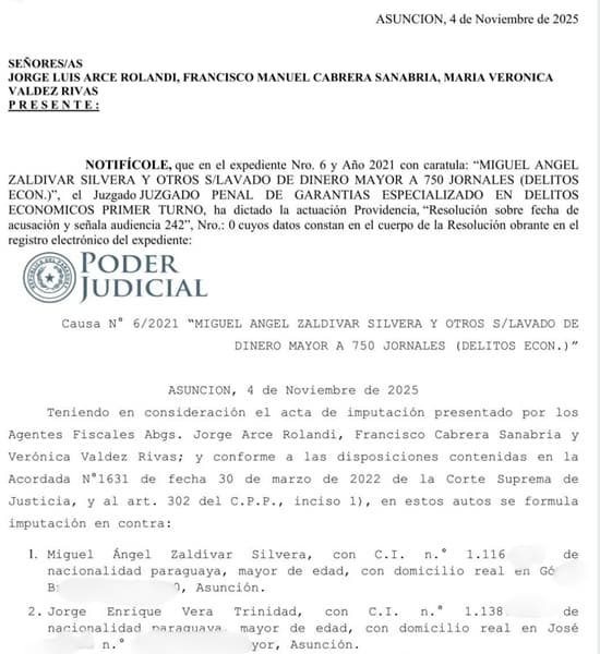 El acta de imputación consigna una deficiente debida diligencia en certificados de depósito asociados a Leoz y alcanza a familiares como beneficiarios de fideicomisos. La entidad sostiene que cumplió con todas las normas del Banco Central y rechaza haber actuado fuera del marco legal. El juez Humberto Otazú admitió la imputación y fijó para el 20 de noviembre la audiencia de imposición de medidas.
