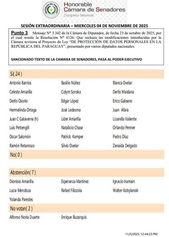El Senado ratificó y sancionó el polémico proyecto de Ley de Protección de Datos Personales, conocida por la oposición como la “versión Frankenstein”. La decisión se tomó con 24 votos de la mayoría oficialista y sus aliados, enviando la norma al Poder Ejecutivo a pesar de las severas advertencias sobre su inconstitucionalidad. Legisladores de la oposición instaron de inmediato al presidente Santiago Peña a ejercer su derecho de veto total.