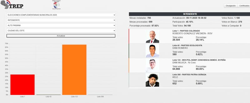 La contienda municipal de Ciudad del Este se define con reglas y plazos habituales. El escrutinio preliminar ofrece un marco de referencia para la lectura política local. El cierre oficial quedará sujeto a la consolidación de actas y al cómputo definitivo de la autoridad electoral.