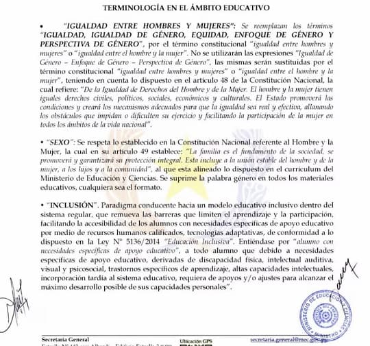 El documento, firmado por el ministro Luis Ramírez y el secretario general Gustavo Rodas, establece que términos como “igualdad de género”, “equidad de género”, “enfoque de género” y “perspectiva de género” deberán ser reemplazados por expresiones como “igualdad entre hombres y mujeres”. Además, la disposición instruye a las direcciones departamentales y supervisores a fiscalizar su cumplimiento en todo el sistema educativo nacional.