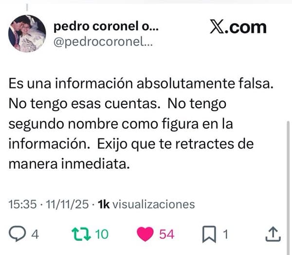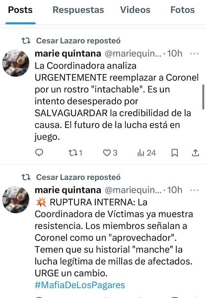 La operación de desprestigio no se limitó a la difusión de juicios falsos. Una cuenta denominada Marie Quintana –identificada como parte de la estrategia de ataque por el patrón de replicación– publicó un hilo señalando una supuesta “ruptura interna” dentro de la asociación. Esta usuaria aseguró que los miembros de la Coordinadora temen que el historial supuestamente “manchado” de Pedro Coronel ponga en riesgo la “lucha legítima” de miles de afectados.