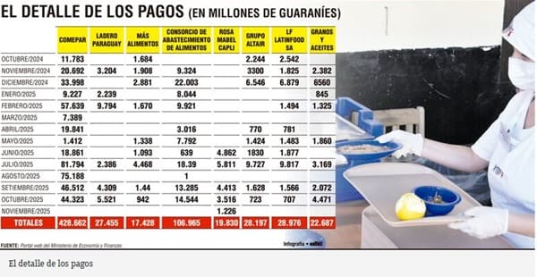 El primer registro a favor de Comepar data del 29 de octubre de 2024, con tres pagos que totalizaron G. 11.780 millones. El 14 de noviembre de ese año se realizaron otros dos desembolsos por G. 20.692 millones, y en diciembre la cifra ascendió a G. 33.998 millones.