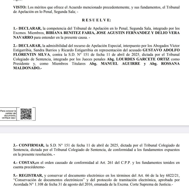 La resolución, firmada de manera unánime por los camaristas Bibiana Benítez Faría, José Agustín Fernández y Delio Vera Navarro, rechazó todos los argumentos presentados por la defensa del uniformado. Los abogados alegaban falta de pruebas directas y errores en la valoración de los elementos producidos en el juicio oral.