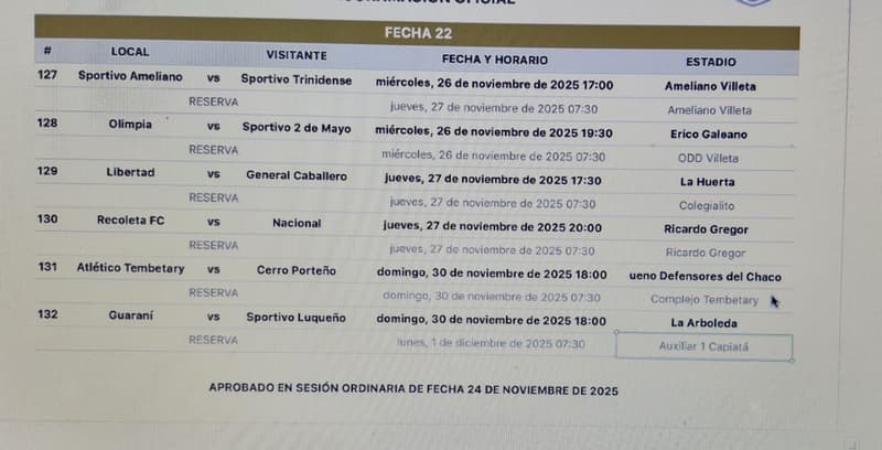 A diferencia de otras jornadas, esta última fecha tendrá una estructura distribuida en tres días. La programación comenzará el miércoles 26 de noviembre con dos partidos: Ameliano enfrentará a Trinidense a las 17:00 en el estadio Fortaleza del Pikysyry, mientras que Olimpia recibirá a 2 de Mayo a las 19:30 en el estadio Erico Galeano. Estos duelos abrirán la jornada, aunque sin incidencia directa en la definición del campeonato.