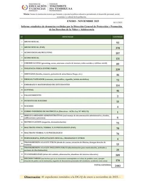 Otras denuncias manejadas por el MEC reflejan una preocupación social creciente. Un total de 509 denuncias corresponden a “vulnerabilidad” de los estudiantes. Estos casos están relacionados con la falta del deber de cuidado y de alimentación por parte de familias o tutores. A pesar del aumento de alumnos matriculados, la cifra de vulnerabilidad incluye denuncias por abandono del sistema educativo en 2025.