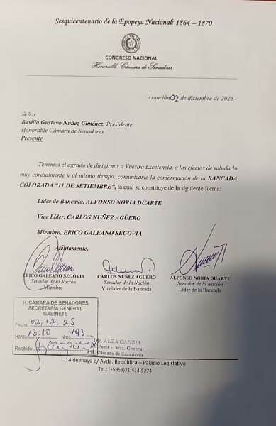 El documento oficial fue presentado al presidente del Senado, Basilio “Bachi” Núñez. En él, Alfonso Noria Duarte asumió como líder del bloque, Carlos Núñez Agüero como vice líder y Erico Galeano como miembro. La bancada se declara independiente del cartismo y no funcionará como un grupo paralelo al oficialismo.