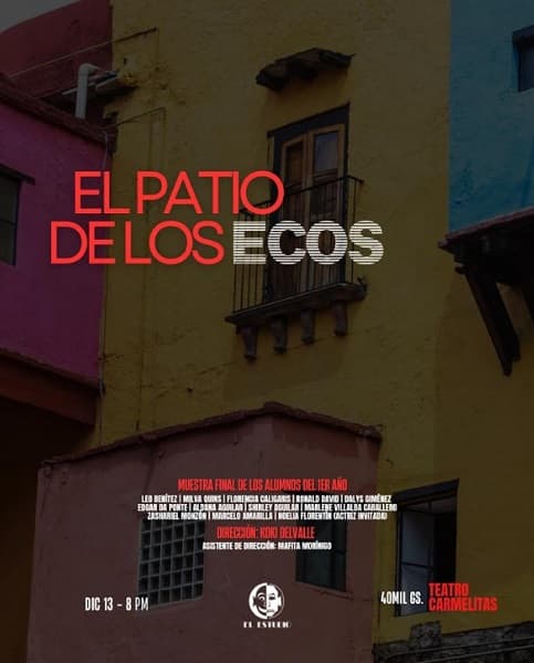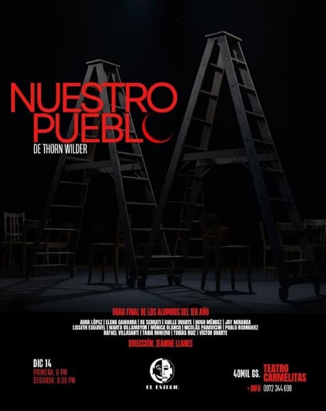 La programación incluye montajes de la Carrera de Actuación. El primer año ofrece “El patio de los ecos”, obra escrita y dirigida por Koki Delvalle, que aborda la resistencia comunitaria ante la amenaza de demolición. Esa función se llevará a escena el sábado 13 de diciembre, a las 20:00, en el Teatro del Salemma Carmelitas. Asimismo, el segundo grupo del primer año pondrá “Nuestro Pueblo”, versión libre de Thornton Wilder, con funciones el domingo 14 a las 18:00 y 20:30, en la misma sala.